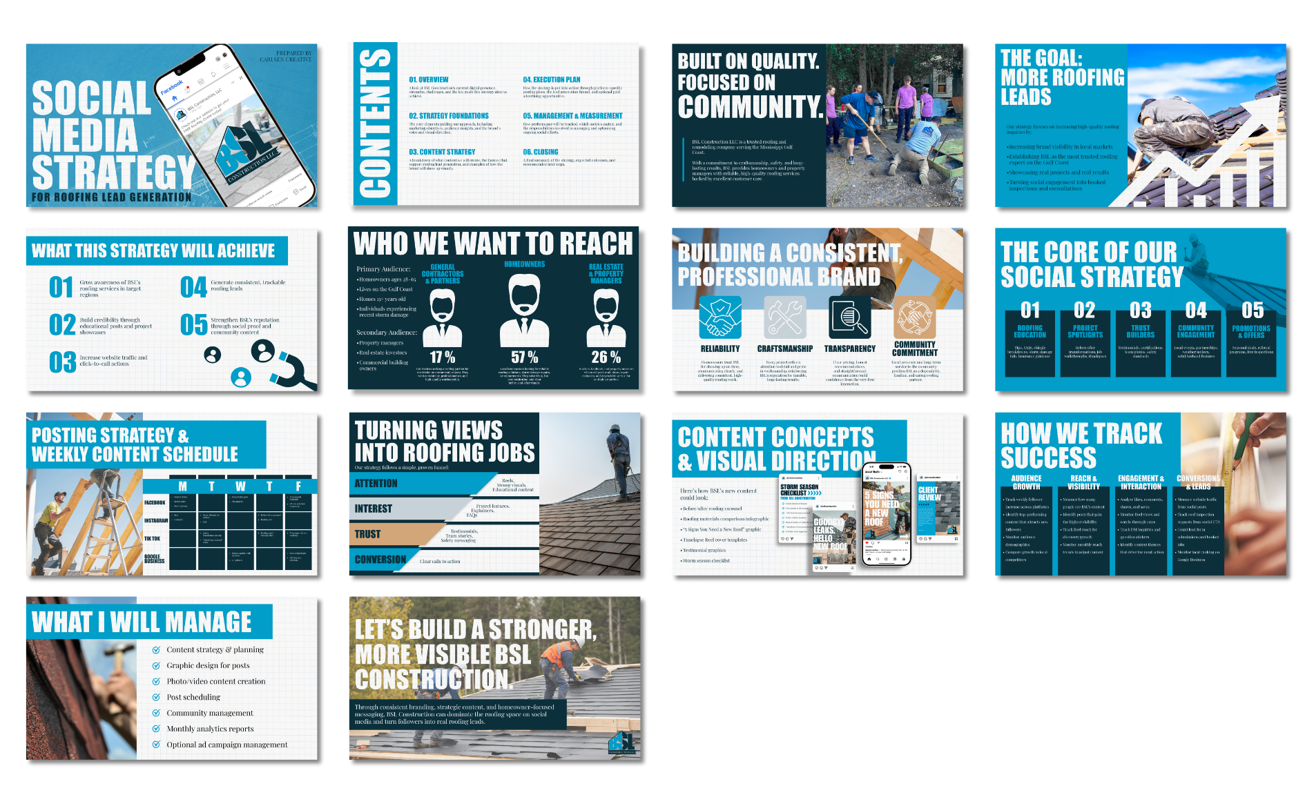 A strategic marketing pitch deck designed to drive roofing leads through clear messaging and cohesive visual direction.